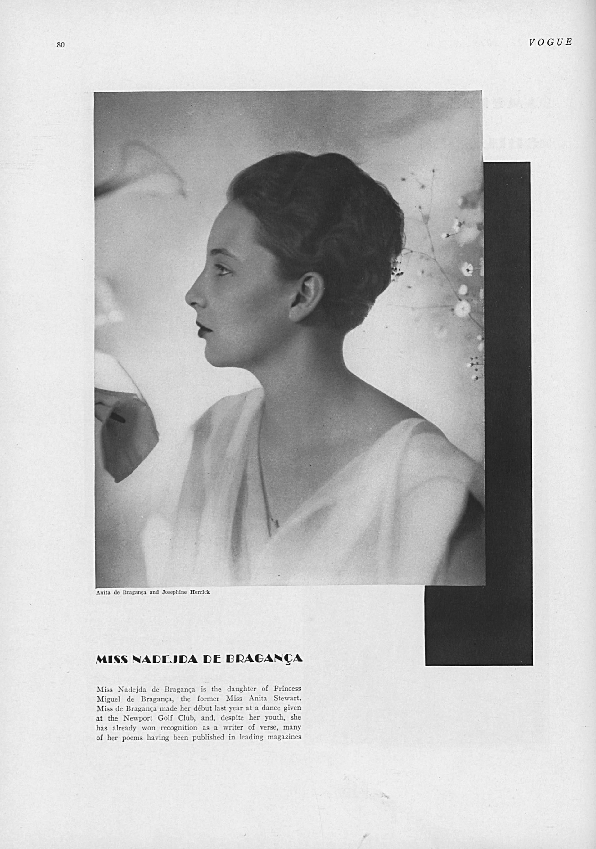 From 1928 to 1940, Herrick and the Princess Miguel de Braganza operated a commercial studio specializing in society portraits, such as this lovely profile view of the Princess' daughter, which appeared in Vogue two months before the stock market crashed. Born Anita Rhinelander Stewart, the Princess was a fixture of the society pages in her youth, having married a pretender to the Portuguese throne. By the time she teamed up with Herrick, she was a middle-aged mother of three, whose profligate husband had abandoned the family.
