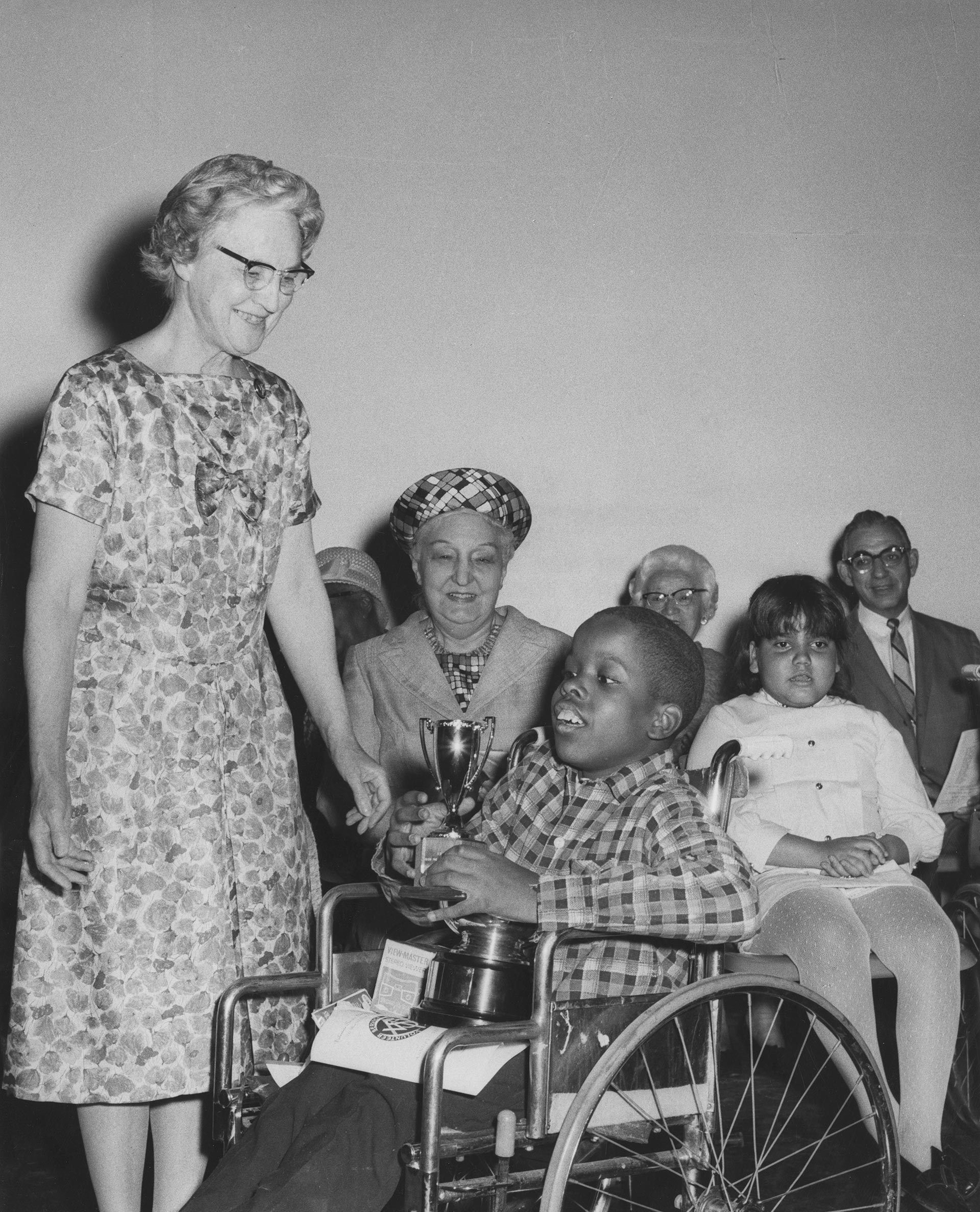 Josephine U. Herrick Presents the Herrick Award to 10-year-old Paul Jackson, 1970,